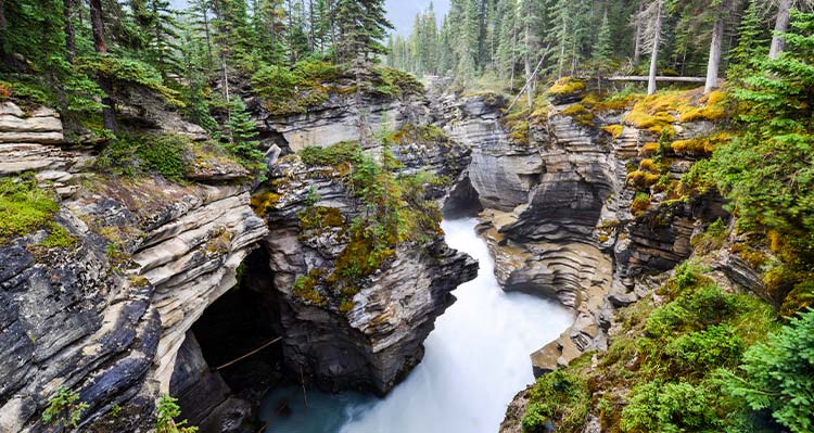 Another iconic waterfall found along the Icefields Parkway, 45-minutes south of Jasper, is Sunwapta Falls. Fed by the Athabasca Glacier, this sightseeing treat is comprised of upper and lower waterfalls. The upper falls are the most accessible and can be seen with ease from the viewpoint parking lot. Visit in late spring and summer, during the snowmelt peak, to witness water thundering over the 18-metre drop-off. For the lower falls, you'll have to hike 1.8 km down from the parking lot. It's well worth your time, as the lower site features three waterfalls cascading into the Sunwapta River.