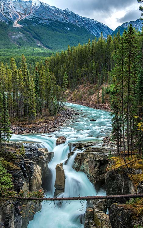 Originating at the Huntington Glacier, Bridal Veil Falls can be effortlessly enjoyed from a dedicated scenic pullout off the Icefields Parkway. However, for added adventure, follow the trail at the south end of the parking lot down to Panther Falls. Prepare for a series of sharp switchbacks along the short path that leads to the waterfall base. A raincoat and protective camera cover is a good idea as the mist can be intense; however, the payoff is 100 percent worth the required precautions.